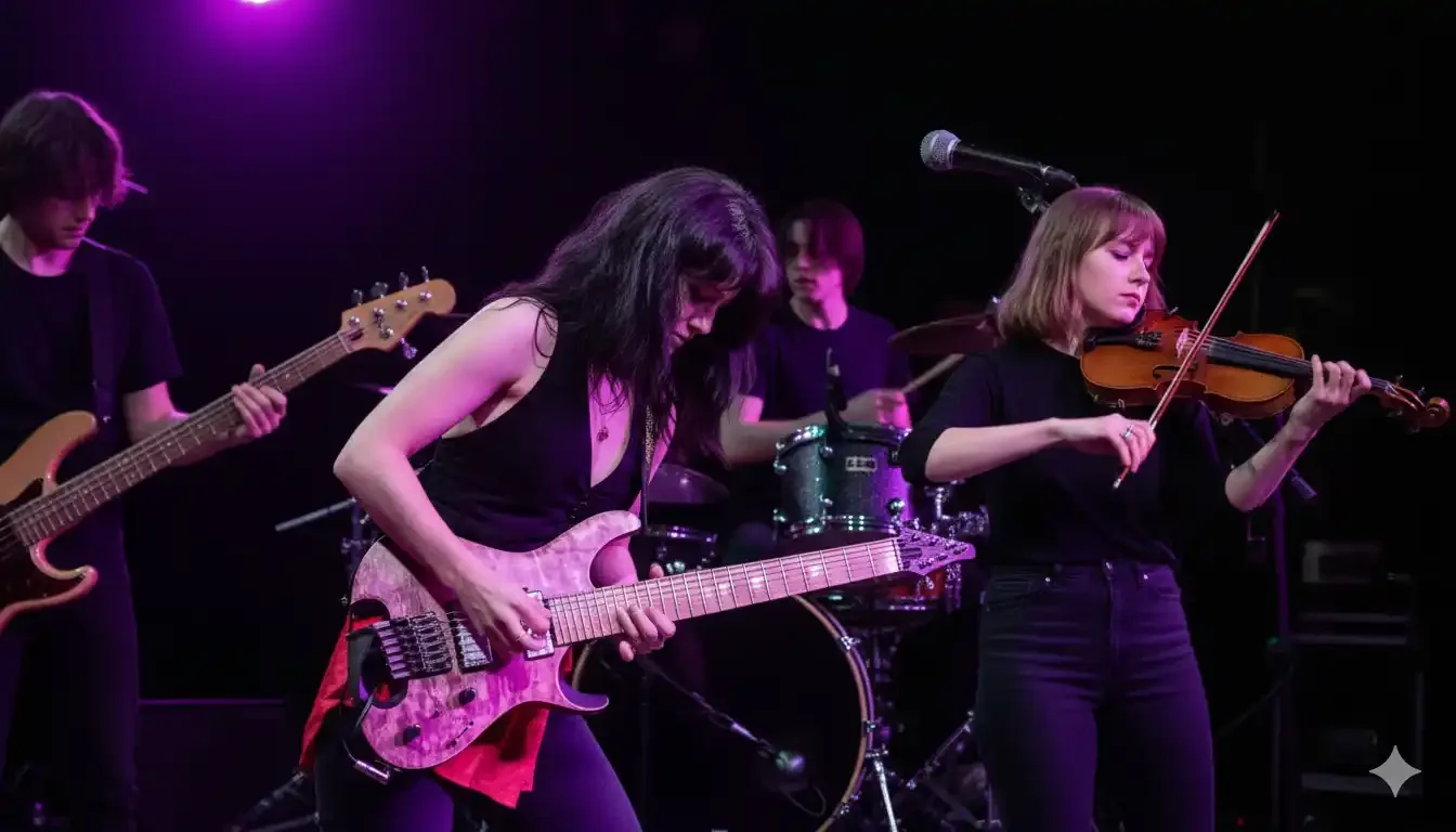 A real band experience where students write original music, learn covers, rehearse together, and create their own band identity